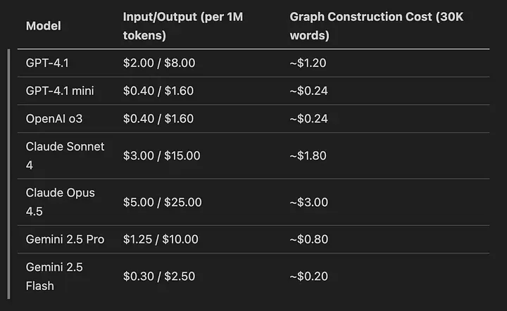 但这些收益是以相当大的成本换来的。使用 2025 年的模型定价构建知识图谱,可以计算其成本结构: