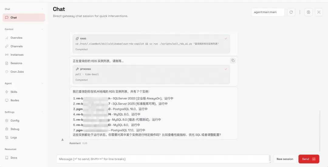 通过Moltbot+RDS AI助手的组合,您可以随时随地管理您的RDS实例,并跟其他SKILL配合使用,例如,您可以让Moltbot创建一个定时任务,每天早上十点获取所有RDS实例最近24小时的慢SQL日志信息并发送到个人邮箱当中。