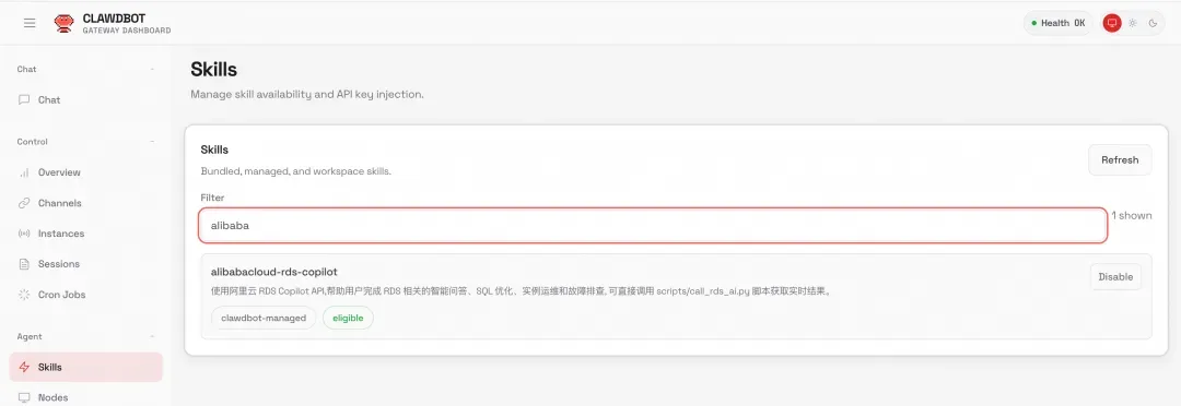 执行命令calwdbot skills list | grep alibabacloud确认Skill状态,或在Clawdbot Console的Skill中可以查到相关配置。