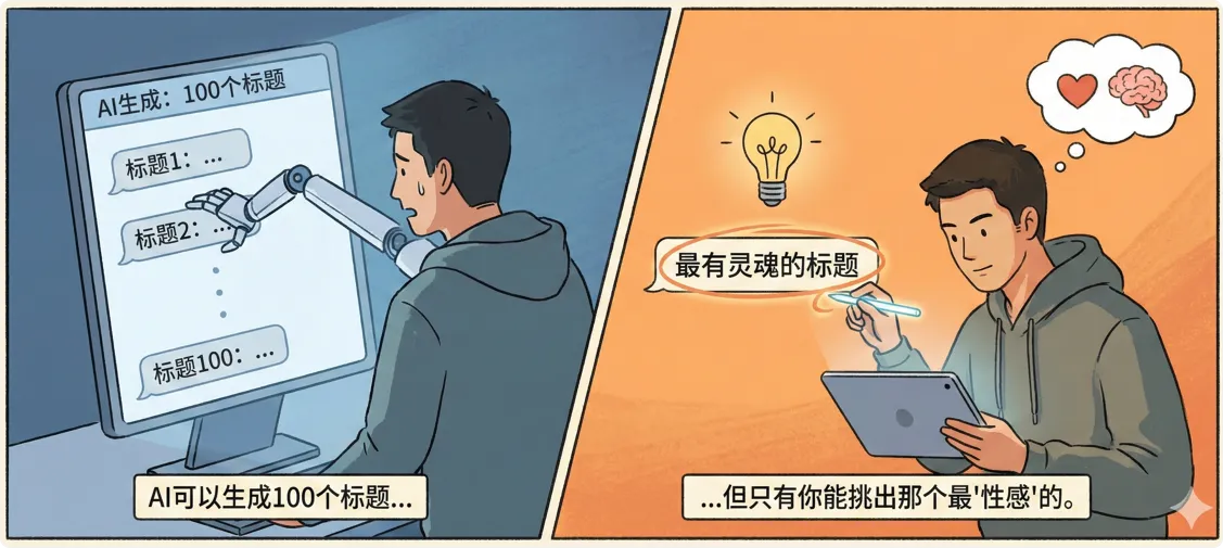 • 审美: 你知道什么是好的,什么是有灵魂的,什么是能打动人的。AI可以生成100个标题,但只有你能挑出那个最“性感”的。AI可以写出一段跑通的代码,但只有资深程序员能判断这代码是不是“优雅”、好维护。