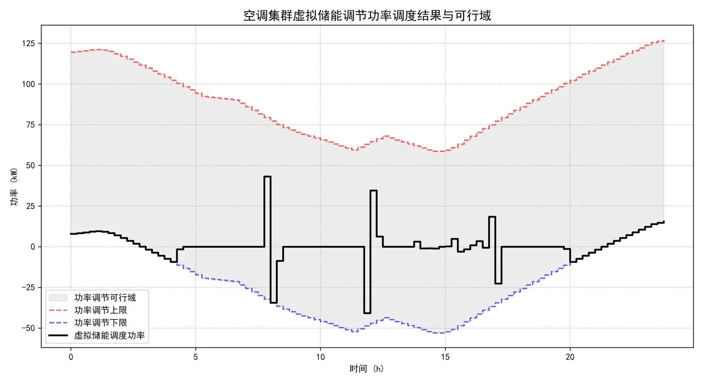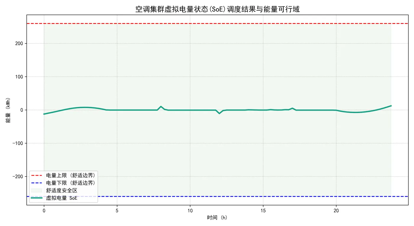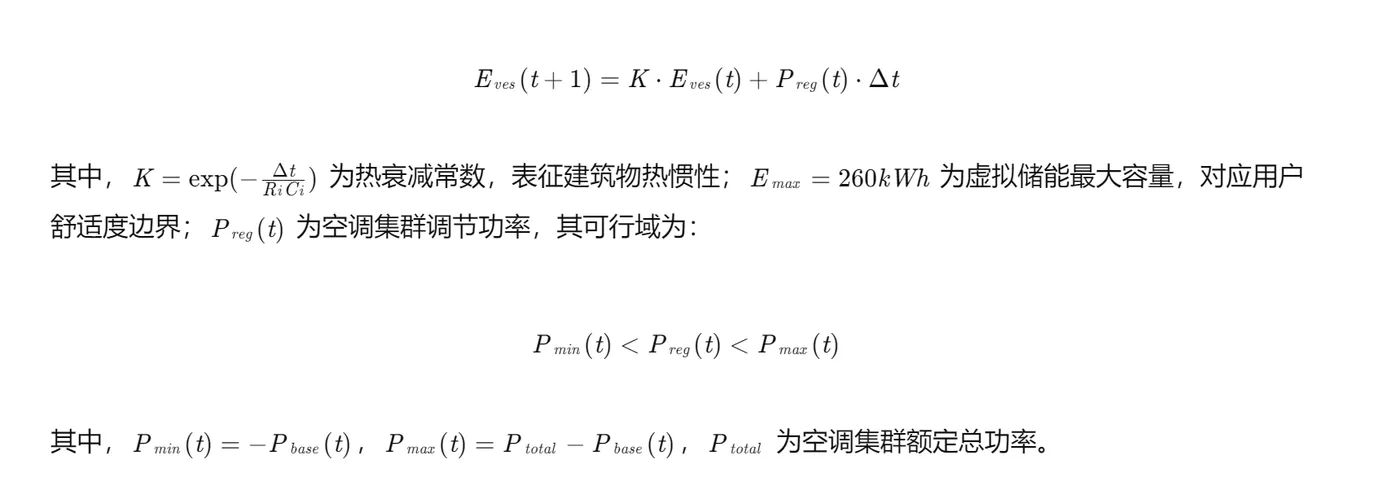 - 建立空调集群动态热力学模型:引入随环境温度变化的动态能效比(COP)机制,将空调集群抽象为虚拟储能系统(VES)。精确计算其功率调节可行域(Pmin_dyn,Pmax_dyn)和能量边界(Emax_val)。