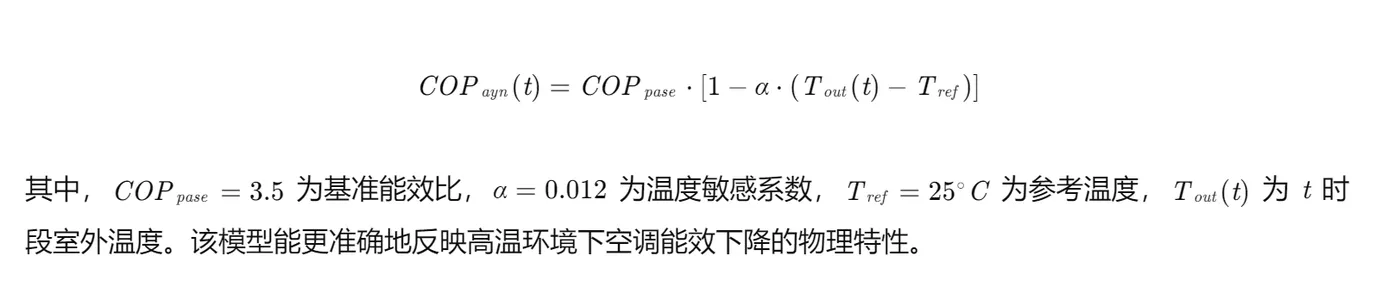 传统虚拟电厂调度模型通常假设设备能效比(COP)为常数,忽略了环境温度对设备效率的显著影响。本文提出一种动态能效比建模方法,反映温度变化对空调制冷效率的非线性影响: