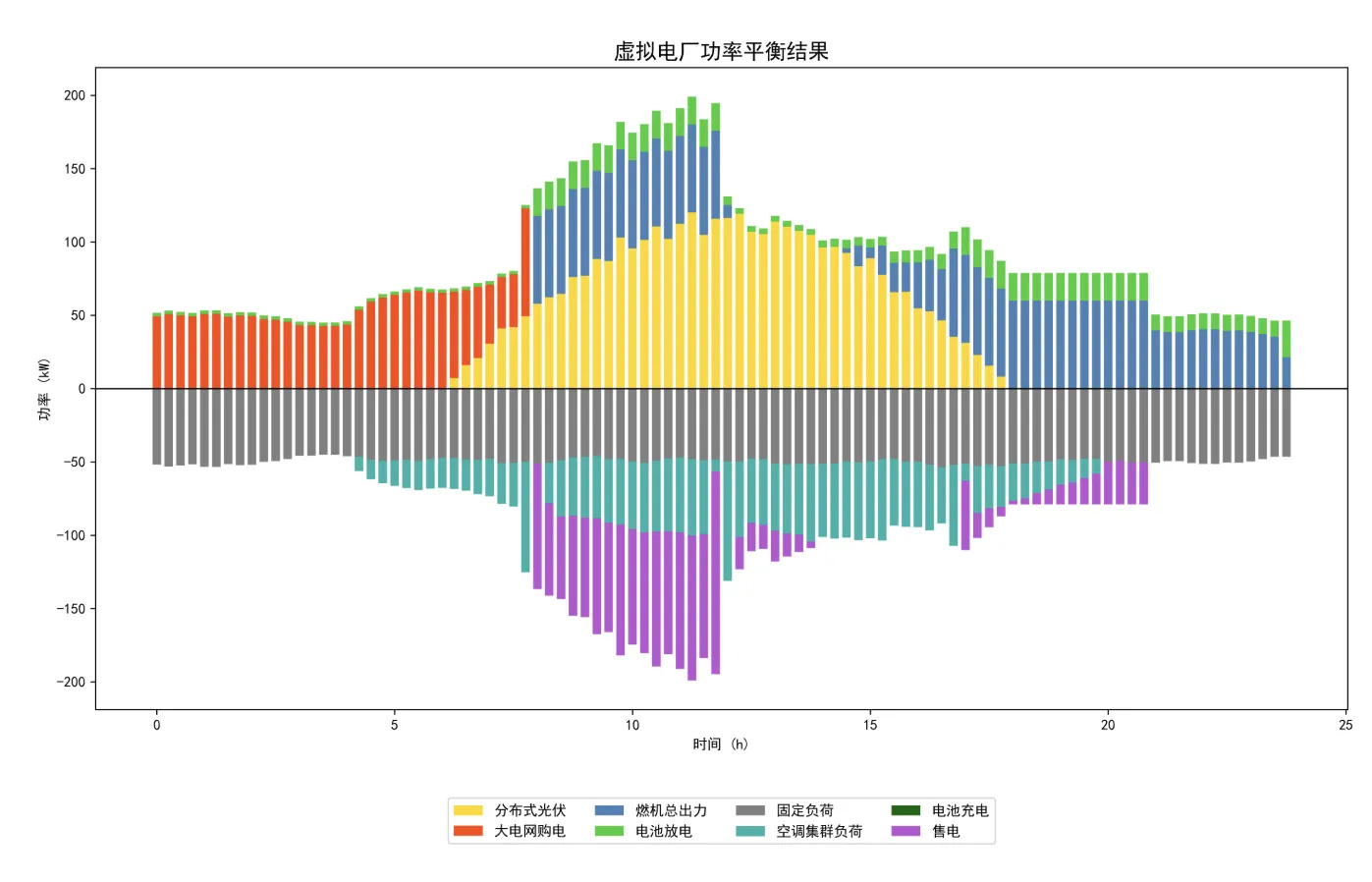 通过五个专业图表全面展示功率平衡状态、机组出力分配、虚拟储能调度特性及其与环境温度的耦合关系。直观呈现多能源协同调度的优化效果,为虚拟电厂运营提供决策支持。