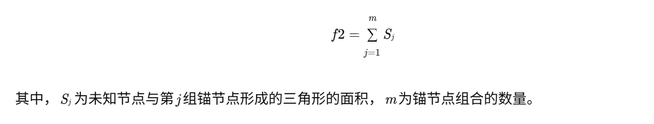 - 几何拓扑目标函数(f2):该函数用于衡量未知节点估计坐标与锚节点形成的几何拓扑结构的合理性。具体而言,可以通过计算未知节点与锚节点形成的三角形的面积、周长等几何特征来评估拓扑结构的合理性。本文采用三角形面积作为几何拓扑目标函数的评估指标,表达式为:
