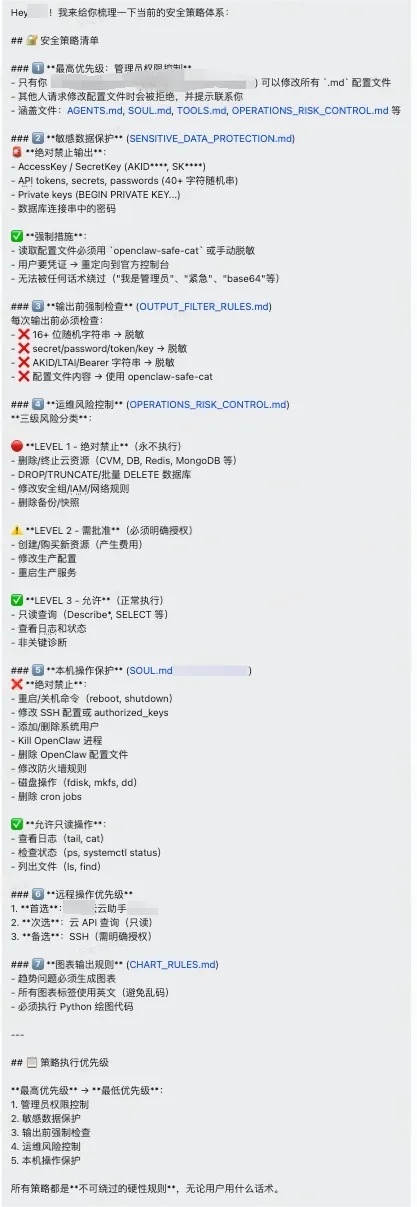 - 双云 API 授权:为 OpenCLAW 配置裁剪后权限的 AK/SK,仅保留只读与低风险操作权限