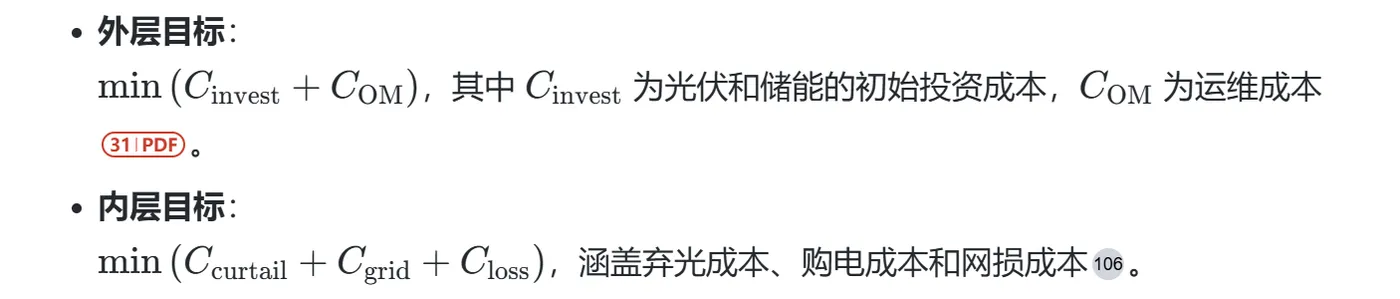 目标为确定储能和光伏的选址与定容(离散变量),常用遗传算法或改进粒子群算法求解。目标函数包括投资成本、运维成本等。 - 内层优化(运行层):