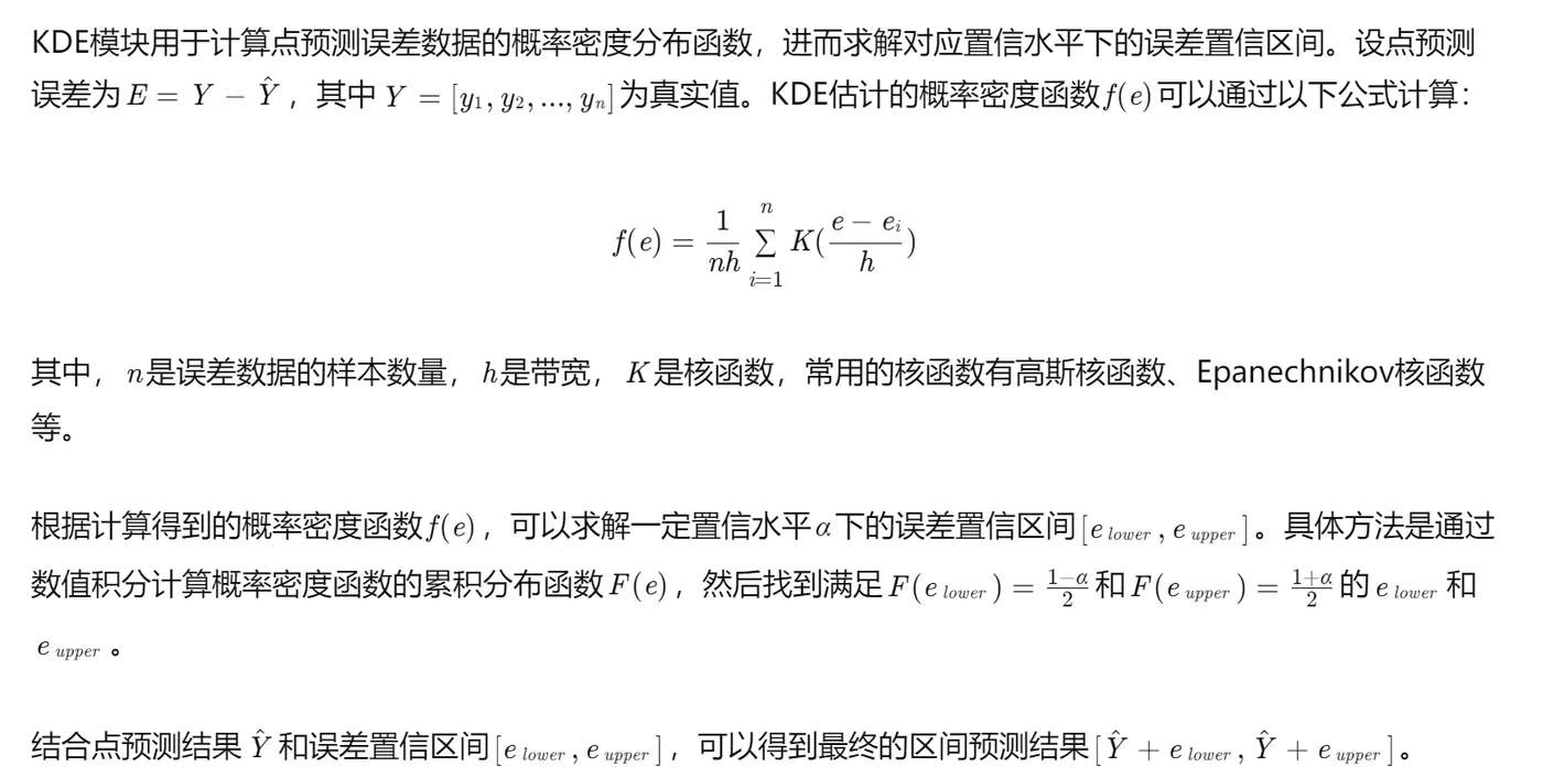 核密度估计(KDE)是一种非参数的概率密度估计方法,它不依赖于数据的具体分布形式,而是根据数据本身的分布来估计概率密度函数。通过KDE方法可以计算点预测误差的概率密度分布,进而求解对应置信水平下的误差置信区间,结合点预测结果实现区间预测。