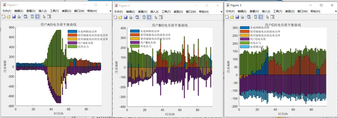 %% 约束条件 for i=1:2 for t=1:96 C=[C, P_pv(i,t)+P_wind(i,t)+P_grid(i,t)+P_ess_b(i,t)-P_ess_s(i,t)-P_load(i,t)==0, %电功率平衡约束 0<=P_ess_b(i,t)<=1000*U_ess_b(i,t), %用户使用共享储能电站放电功率约束 0<=P_ess_s(i,t)<=1000*U_ess_s(i,t), %用户使用共享储能电站充电功率约束 U_ess_b(i,t)+U_ess_s(i,t)<=1, %避免同时出现充放电的情况,故增加此约束 P_grid(i,t)>=0, ]; %电功率平衡约束 end end P_hP_h=sum(P_h); for t=1:96 C=[C, P_pv(3,t)+P_wind(3,t)+P_grid(3,t)+P_ess_b(3,t)-P_ess_s(3,t)-P_load(3,t)-P_hP_h(t)==0, %电功率平衡约束 0<=P_ess_b(3,t)<=1000*U_ess_b(3,t), %用户使用共享储能电站放电功率约束 0<=P_ess_s(3,t)<=1000*U_ess_s(3,t), %用户使用共享储能电站充电功率约束 U_ess_b(3,t)+U_ess_s(3,t)<=1, %避免同时出现充放电的情况,故增加此约束 P_grid(3,t)>=0, ]; %电功率平衡约束 end %储能电站荷电状态连续性约束 C=[C,E(1)==E_init+0.95*P_abs(1)/4-P_relea(1)/0.95/4,]; %1时段和其他时段不同,涉及E(0) for t=2:96 C=[C,E(t)==E(t-1)+0.95*P_abs(t)/4-P_relea(t)/0.95/4,]; end for t=1:96 C=[C,0.1*E_max<=E(t)<=0.9*E_max,]; end C=[C,E_init==0.2*E_max,E(96)==E_init,]; %储能电站的充放电功率约束,用文章2.3中的Big-M法进行线性化处理 M=1E8; %这里的M是个很大的数 for t=1:96 C=[C, 0<=P_abs(t)<=P_max, 0<=P_abs(t)<=U_abs(t)*M, 0<=P_relea(t)<=P_max, 0<=P_relea(t)<=U_relea(t)*M, U_abs(t)+U_relea(t)<=1, ]; end %储能电站充放电功率平衡约束 for t=1:96 C=[C, (P_ess_b(1,t)-P_ess_s(1,t))+(P_ess_b(2,t)-P_ess_s(2,t))+(P_ess_b(3,t)-P_ess_s(3,t))==P_relea(t)-P_abs(t), ]; end %% 目标函数 C1=sum(gamma.*P_grid(1,:))+sum(gamma.*P_grid(2,:))+sum(gamma.*P_grid(3,:)); %用户群从电网购电费用 C2=sum(de.*(P_ess_b(1,:)+P_ess_s(1,:)))+sum(de.*(P_ess_b(2,:)+P_ess_s(2,:)))+sum(de.*(P_ess_b(3,:)+P_ess_s(3,:))); %用户群向储能电站缴纳的服务费 F1=C1+C2; %上层目标函数:经济性最优 % F2=sum(abs(P_grid(1,2:end)-P_grid(1,1:end-1)))+sum(abs(P_grid(2,2:end)-P_grid(2,1:end-1)))+sum(abs(P_grid(3,2:end)-P_grid(3,1:end-1))) % %% 模型求解 ops=sdpsettings('solver','cplex');