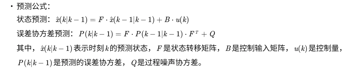 - 根据系统的动态模型,预测下一时刻的状态和误差协方差。