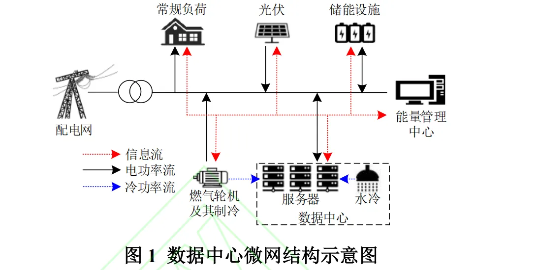 中心巨大耗电量带来的高昂电费支出,数据中心运营商倾向于尽可能利用可再生资源以削减开支[2],此外,为了满足数据中心对供电可靠性的严格要求,运营商通常会配备相应的储能,燃气轮机,柴油发电机等多种备用电源[3],同时,考虑到我国近年来对于微网的大力支持,鼓励以特许经营等方式开展各类微网项目的建设运营,因此很多数据中心运营商选择建设独立的,以数据中心为主体的数据中心微网[4]。