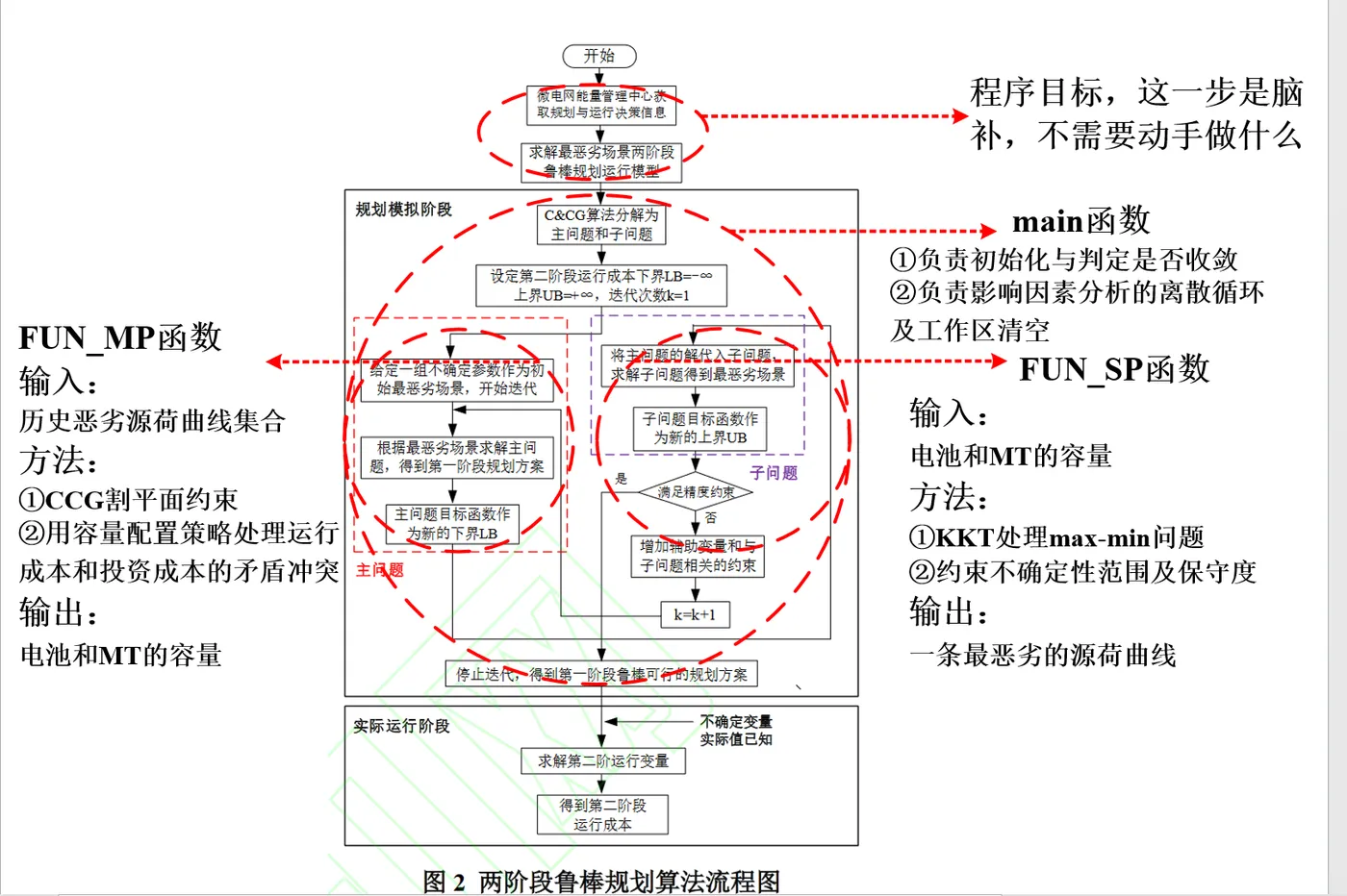 两阶段鲁棒优化模型的求解是一个具有挑战性的问题,特别是当模型规模较大时。常用的求解方法是将原始问题转化为易于求解的形式,例如利用强对偶理论将内部的最小问题转化为对偶问题,从而将最大-最小问题转化为最大问题。然后,再通过对偶问题进行求解。列与约束生成算法(Column-and-Constraint Generation, C&CG)是求解两阶段鲁棒优化问题的有效方法。该算法通过迭代的方式,在主问题和子问题之间进行交互,最终收敛到最优解。