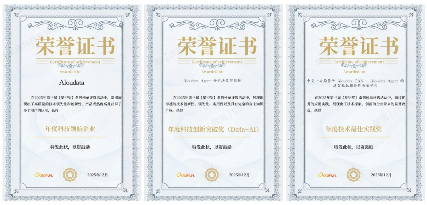 Aloudata 大应科技凭借在众多行业数智化头部企业的高质量 NoETL 数智实践荣获“年度科技领航企业”;Aloudata 自主研发的分析决策智能体 Aloudata Agent,以独创的 NL2MQL2SQL 技术路径和实用性荣获“年度科技创新突破奖(Data + AI)” ;与客户中交一公局携手构建智能数据分析决策平台,荣获“年度技术最佳实践奖”。