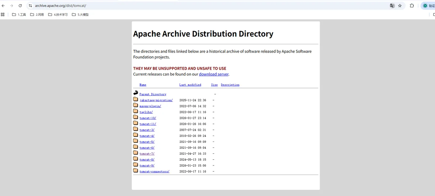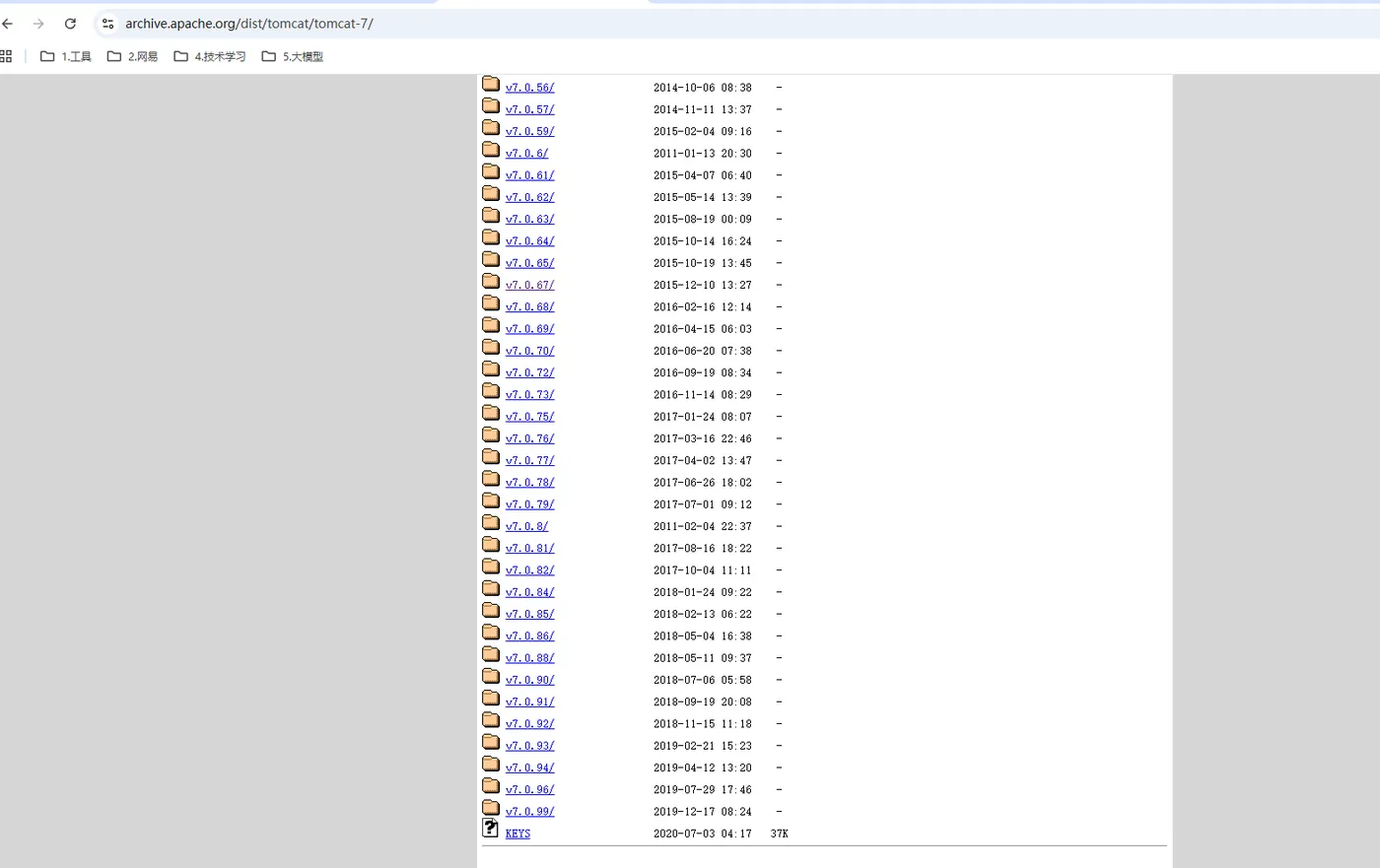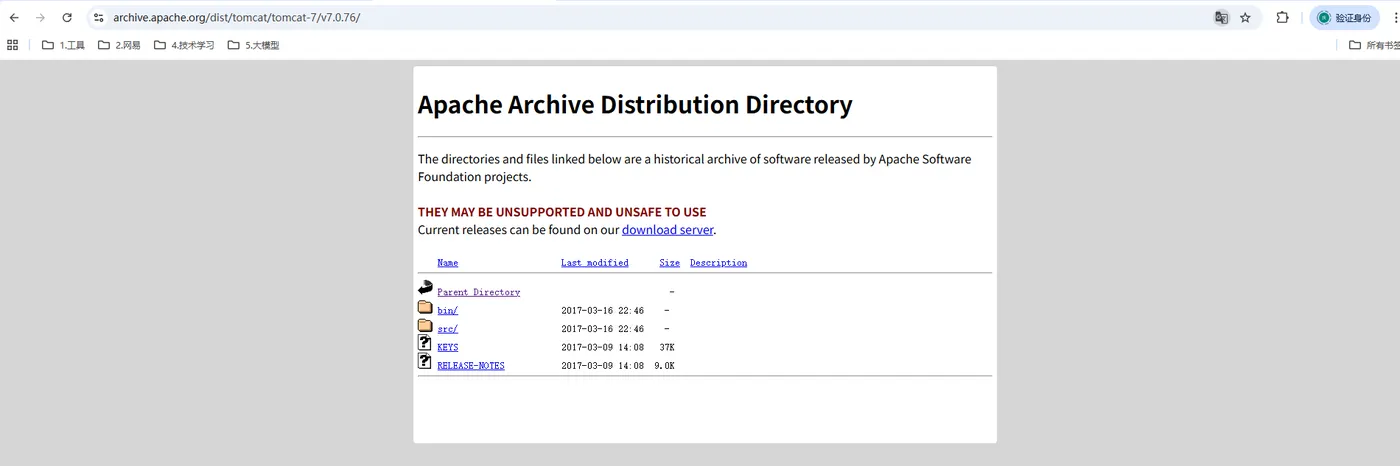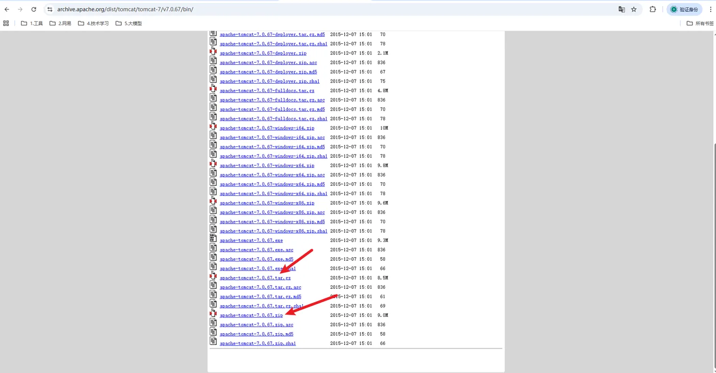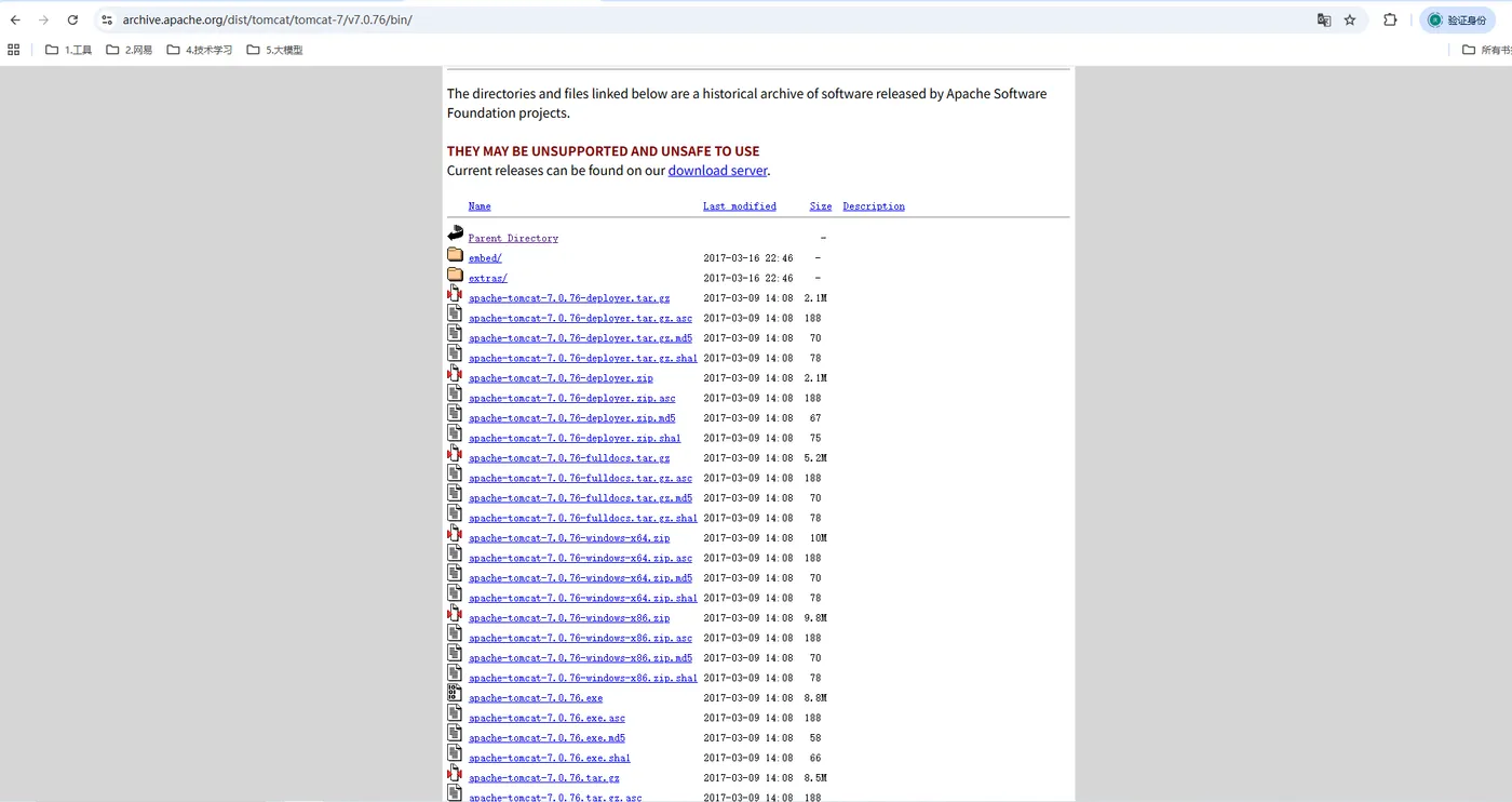 如果想下载历史版本,比如我就想下载 Tomcat 7.x 版本,点击:Archives,进入如下页面: