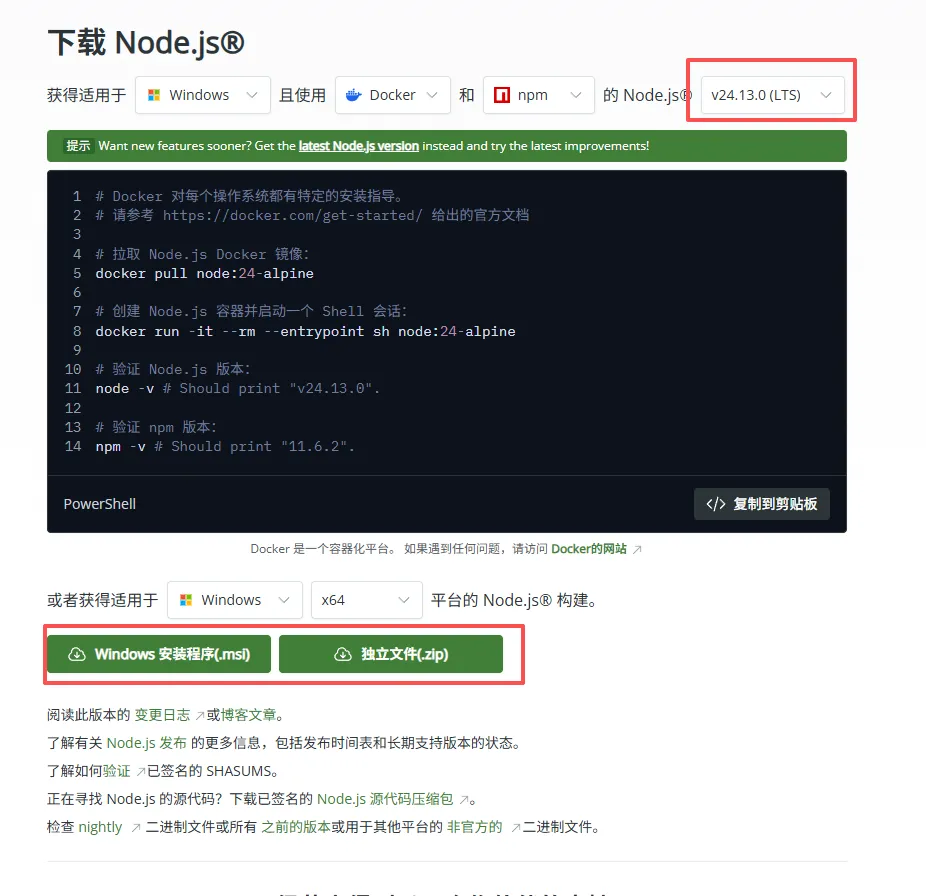 - 步骤一:打开 Node.js 官方下载地址,下滑找到「Windows 安装程序」,选择 64 位 独立文件 .zip 格式(LTS 版),点击下载(根据系统自动识别,一般默认 64 位)。
