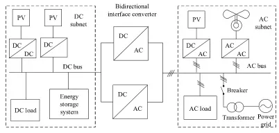 - 能源单元:光伏(PV)、风电等可再生能源,通过DC/AC变换器接入直流/交流母线。