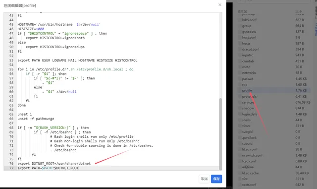 3、通过vim命令或ssl文件管理打开/etc/profile文件,复制下面两行到文件底部
