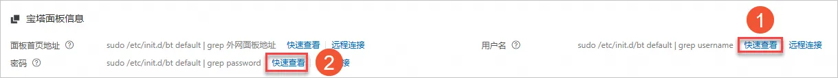- 单击应用详情页签,在宝塔面板信息区域,依次单击快速查看,获取宝塔面板的用户名和密码。