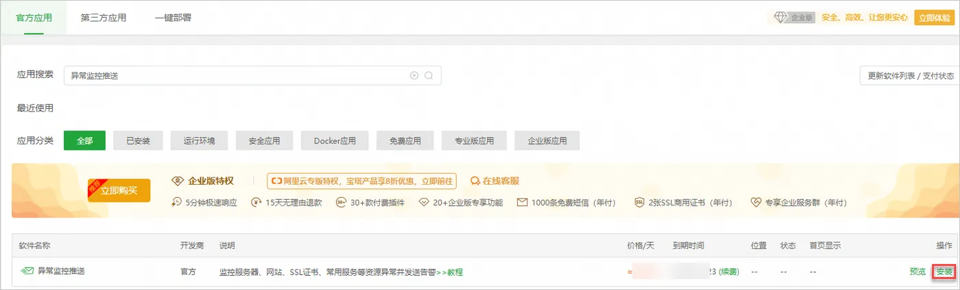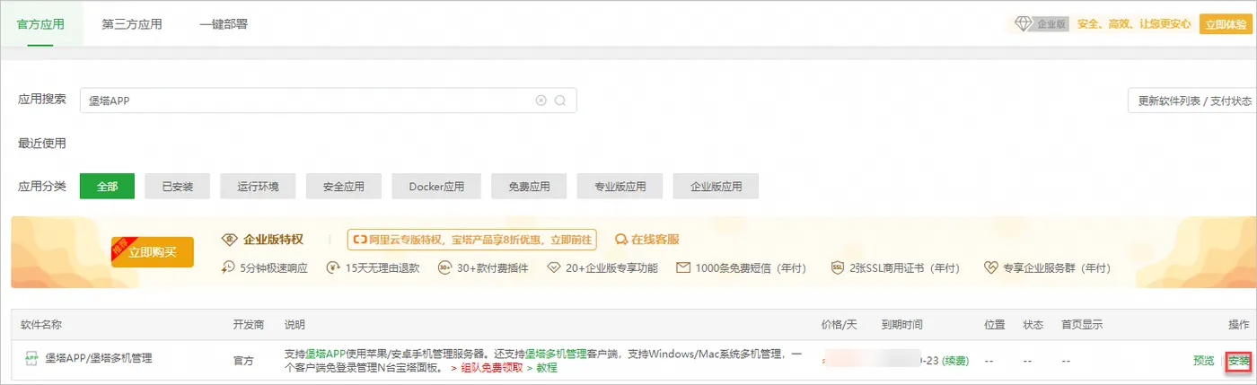 堡塔APP搜索软件,即可看到软件已经可以免费安装,单击安装,根据界面提示完成安装操作。