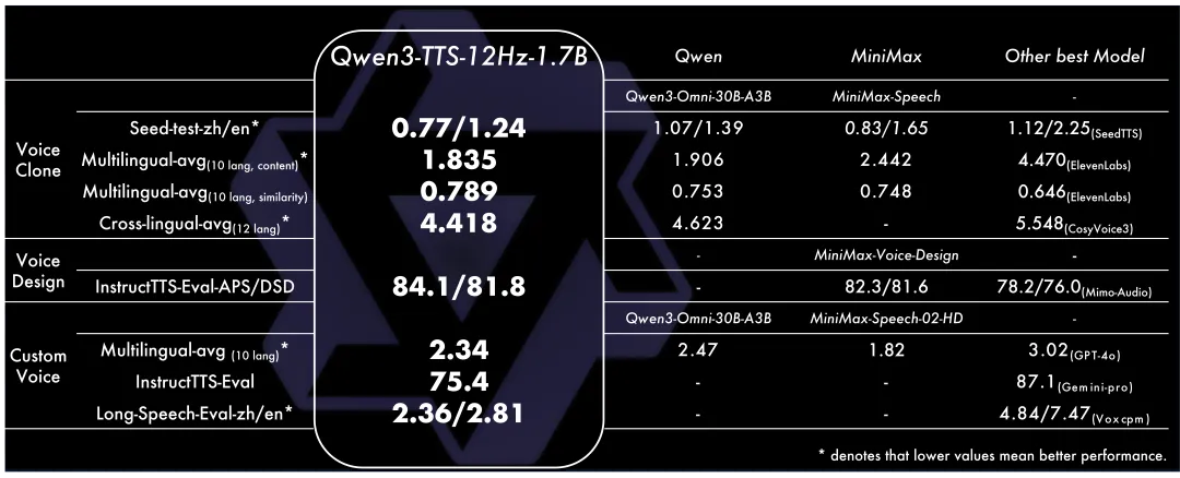 - 高效架构:采用轻量化非 DiT 架构,配合 Qwen3-TTS-Tokenizer-12Hz,实现高保真的语音重构。