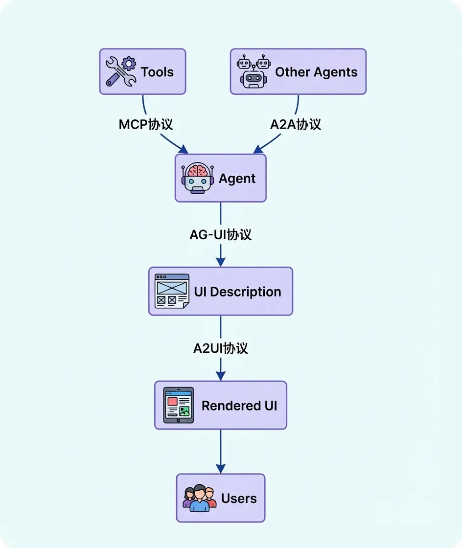 - A2UI 与 A2A:可以通过 A2A 直接向客户端前端发送 A2UI 作为数据格式的消息。