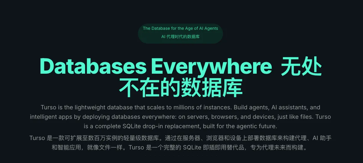 Turso是一个基于libSQL(SQLite开源分支)构建的边缘托管分布式数据库,它让SQLite从"单机版"变成了"全球版"——数据自动同步到35+边缘节点,用户在哪里,数据库就在哪里。 简单来说,它就像给你的SQLite装上了"瞬间移动"能力:原本需要150ms的跨国查询,现在只要5ms;原本需要部署复杂集群的分布式架构,现在一条命令搞定。更疯狂的是,它完全兼容SQLite,意味着你现有的SQL知识、工具、ORM全部可用,但性能却提升了10倍,成本却降到了传统云数据库的1/10。