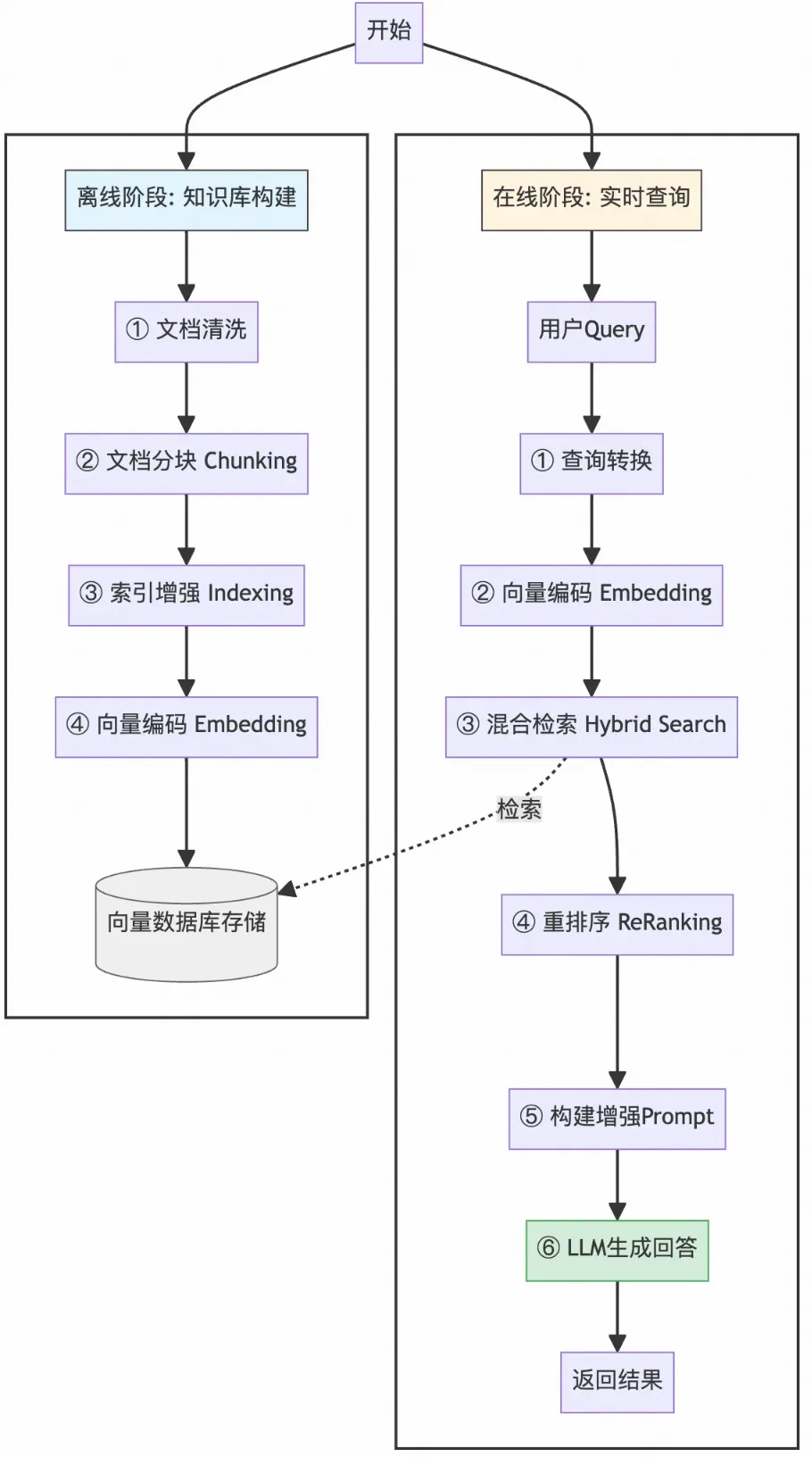 RAG 系统包含两个核心阶段:离线阶段构建知识库,在线阶段处理实时查询。以下详细介绍高级 RAG 系统在这两个阶段的关键实现流程。