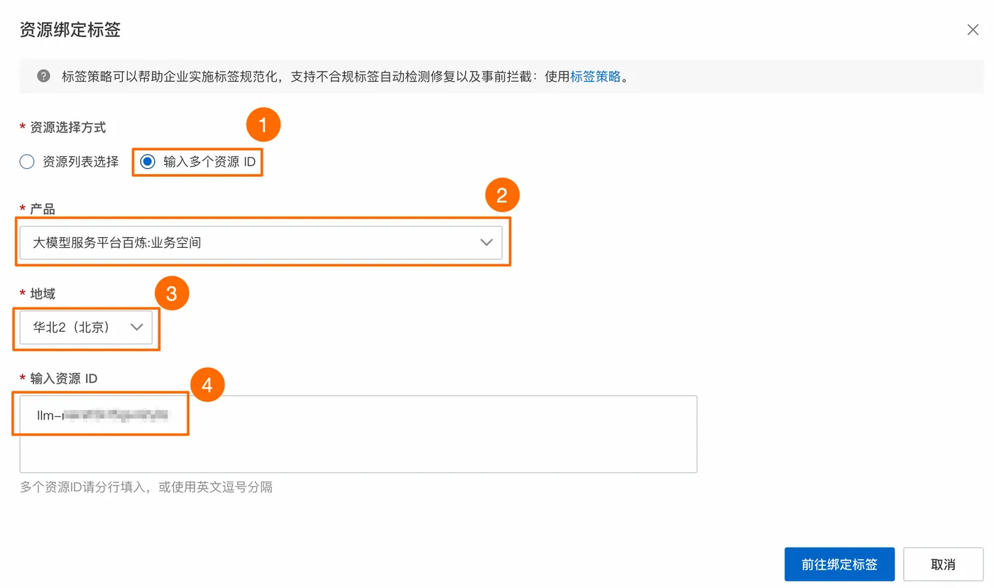 - 资源选择方式选择“输入多个资源ID”,在产品选项卡搜索并选择“大模型服务平台百炼:业务空间”并选择业务空间对应地域,资源ID输入框中填写Workspace ID,完成后点击绑定标签按钮执行操作。