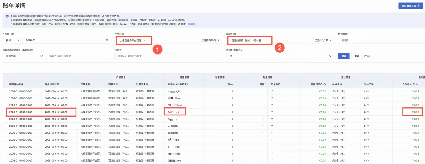 在账单详情页面中导出,可在账单(按小时聚合)中查看指定知识库在对应时段的规格费用(目录总价列)。