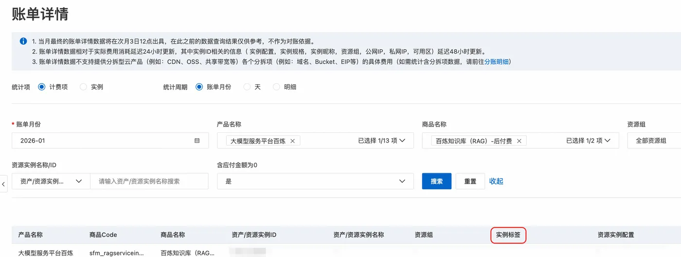 至此您已完成对阿里云百炼业务空间的标签绑定,您可在账单详情页面通过实例标签列验证与查询业务空间的绑定标签。