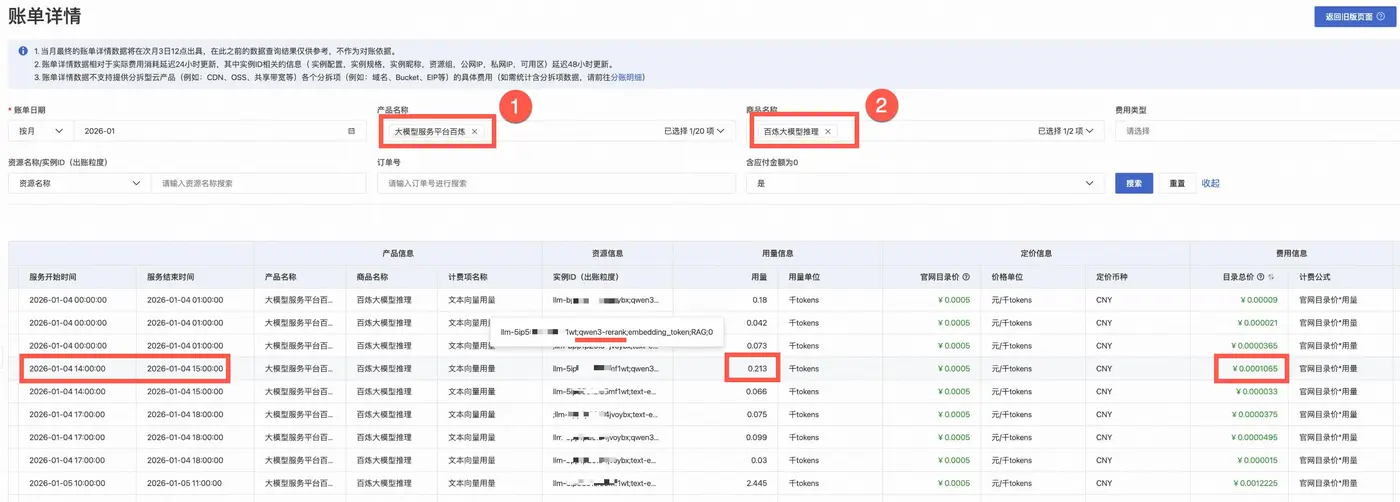 将鼠标悬停在账单的实例ID上方:如果实例ID形如llm-xxx;xxx-embedding-xxx;embedding_token;RAG;0,表示该账单由向量模型产生。