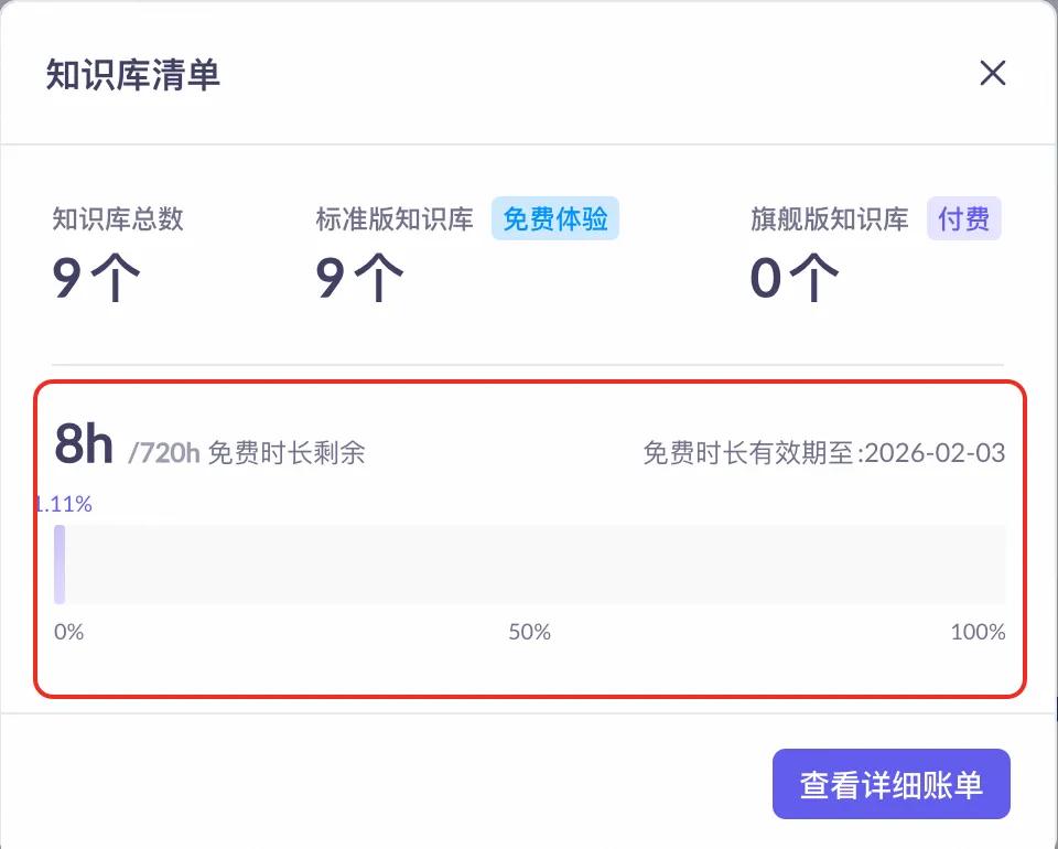 可在知识库页面右上角点击查看账单,以查看剩余免费时长及有效期。