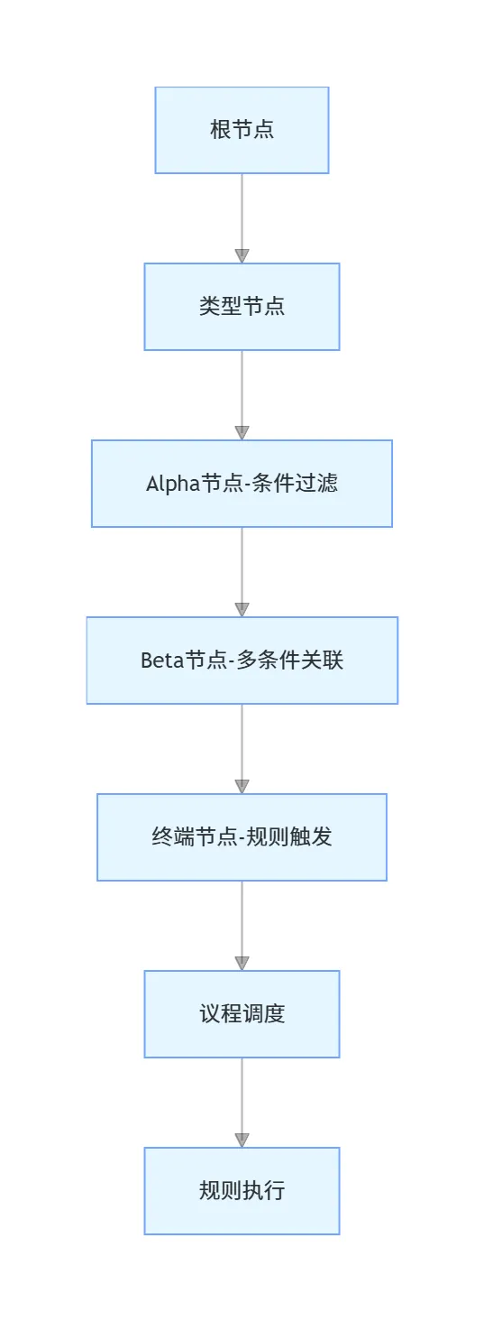 Rete算法会将所有规则拆解成节点,构建一个有向无环图(Rete网络),核心节点与执行流程如下: