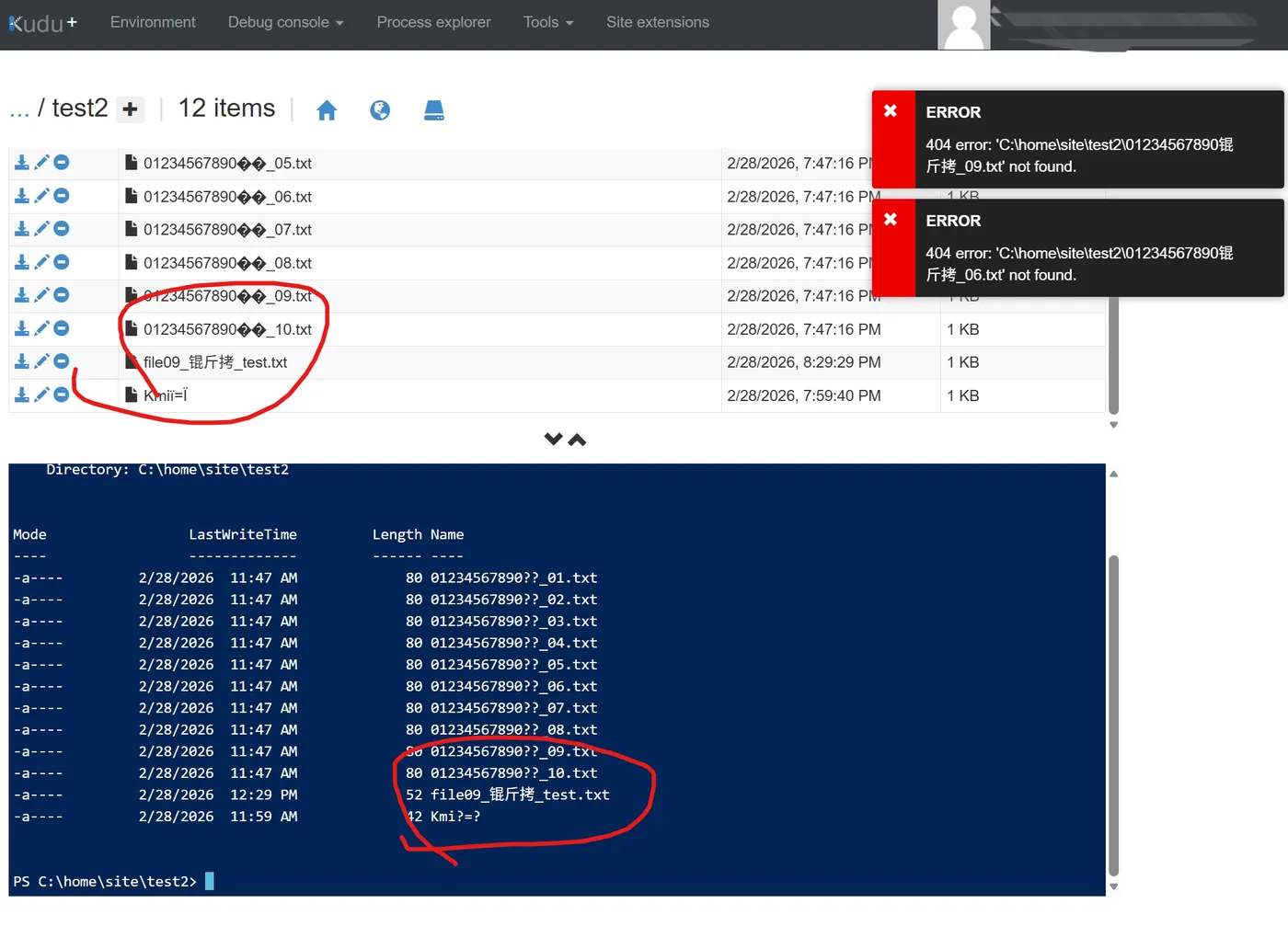 简介: 本文描述Azure App Service Kudu控制台中文件目录UI显示为空(实际有文件),但PowerShell的`ls`命令可正常列出的问题。通过浏览器开发者工具定位到Unicode字符编码错误(\uDC6D),根源是文件名含非法代理对字符。解决方案:检查并重命名本地文件。