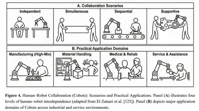 El Zataari等人[125]确定了四种不同的协作场景,定义了操作员与Cobots在共享工业工作空间中的交互方式。这些配置反映了人机协作中日益增长的相互依赖性和认知需求,如图4A所示: