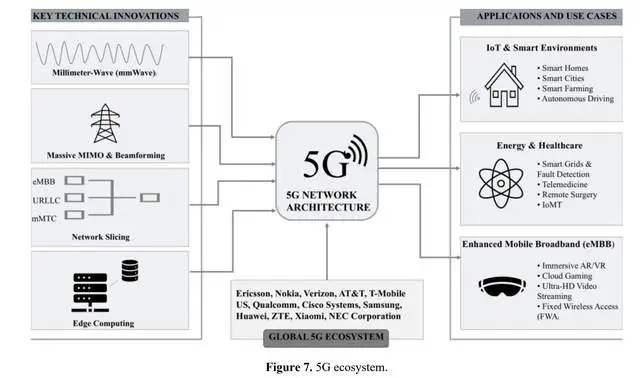 第五代移动网络代表无线通信领域的重大进步,旨在满足对更高数据速率、超低延迟、海量设备连接和增强可靠性的日益增长的需求。与以往世代不同,5G不仅仅是速度更快,还能支持自动驾驶汽车、远程手术、AR/VR和工业自动化等新应用场景]。为支持图7所示的多元化利益相关者与应用生态系统,5G通过以下关键创新实现这些功能,包括: