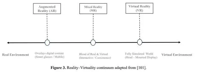 AR则通过实时叠加数字内容(如文本、图像和音频)来增强操作员的现实环境,促进数字系统与物理工作空间之间的无缝信息流动。现代AR解决方案通过智能眼镜或移动设备提供,越来越多地应用于制造和物流领域,支持引导装配、质量控制、库存拣选和设备维护等任务。MR融合了现实与虚拟世界,使物理和数字对象能够实时共存与互动。MR系统通常使用HMD,让用户无缝交互物理和虚拟物品[107]。图3展示了现实-虚拟连续体,概述了更广泛的XR领域,并将VR、AR和MR分布于现实与完全虚拟环境之间的连续体上。