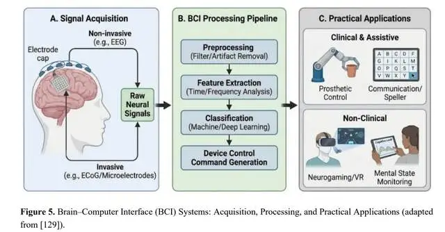 如图5所示,标准的BCI系统通过由五个主要阶段组成的明确定义的顺序流程实现直接的脑机通信:信号采集、预处理、特征提取、分类和设备控制。最初,信号采集通过非侵入式方法(如脑电图EEG)或侵入式技术(如皮层脑电图ECoG或植入式微电极)捕获脑活动,其中非侵入式方法适用范围广,而侵入式技术虽分辨率更高但存在手术风险。随后,预处理步骤去除原始神经信号中的噪声和伪迹,以提升分析质量。预处理后的信号进入特征提取阶段,从中分离出与用户心理状态或意图相关的特定模式或特征(例如,频带功率、事件相关电位ERP)。这些提取的特征随后输入分类阶段,机器学习算法将神经模式转化为离散的命令或决策。最后,设备控制执行这些命令,使用户能够操作机器人假肢、通信拼写器或虚拟现实环境等外部设备,反馈机制对用户适应和性能优化至关重要。