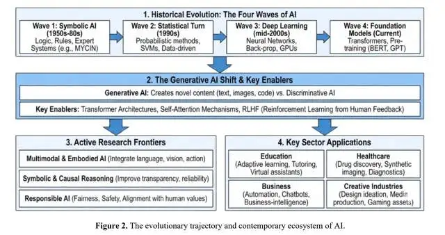 AI——广义上被定义为在机器中形式化再现人类推理——其概念根源于图灵(1950)的早期工作,并正式定义为一个领域。第一波浪潮,即20世纪50年代至80年代的符号AI,依赖于形式逻辑、基于规则的系统和符号搜索算法来模拟专家知识和推理。这一波浪潮支撑了早期专家系统如MYCIN和XCON,广泛应用于诊断和配置任务。第二波浪潮出现在1990年代,标志着统计和概率方法的转向,引入了贝叶斯推断、隐马尔可夫模型和支持向量机。这些技术使系统能够从经验数据中识别模式,从而将重点从手动规则编码转向数据驱动的学习。第三波浪潮由2000年代中期开始的深度学习革命推动。多层神经网络、反向传播算法以及GPU的应用带来了重大突破,使得从图像、音频和文本等非结构化输入中学习层次化表示取得了显著进展。