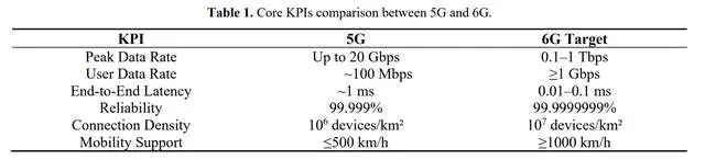 随着超智能连接需求的增长,5G的局限性逐渐显现,6G无线系统的愿景作为一种变革性范式应运而生,旨在满足未来数字社会前所未有的需求。预计2030年左右商业化,6G将提供超高数据速率、超低延迟和泛在连接,性能比5G高出数个数量级。根据当前研究共识,6G的目标KPI在几乎所有维度上均显著超越5G,详细对比见表1。这些指标旨在支持实时XR、高精度工业控制、3D全息和触觉互联网服务等颠覆性应用。