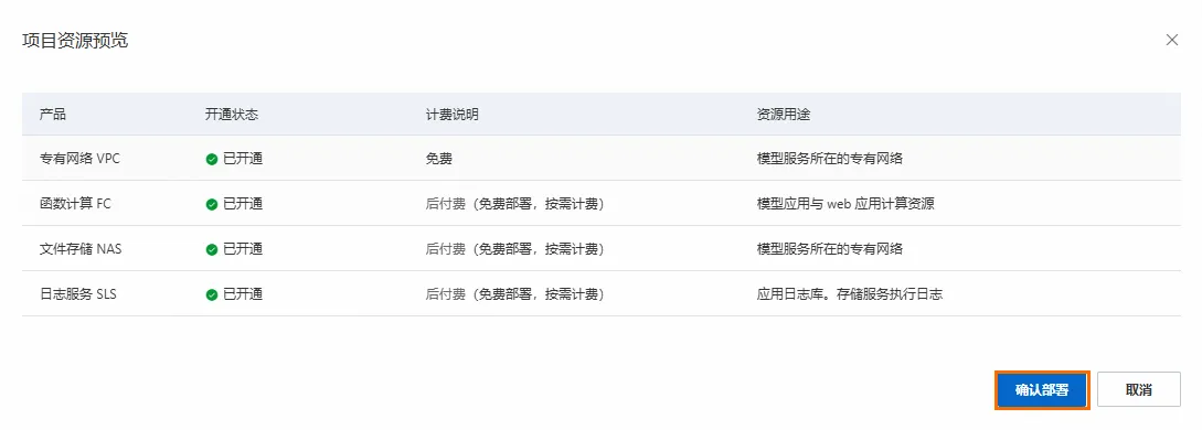 2. 选择地域,单击部署项目,在项目资源预览对话框中,您可以看到相关的计费项,详情请见计费涉及的产品。单击确认部署,部署过程大约持续 10 分钟左右,状态显示已部署表示部署成功。说明