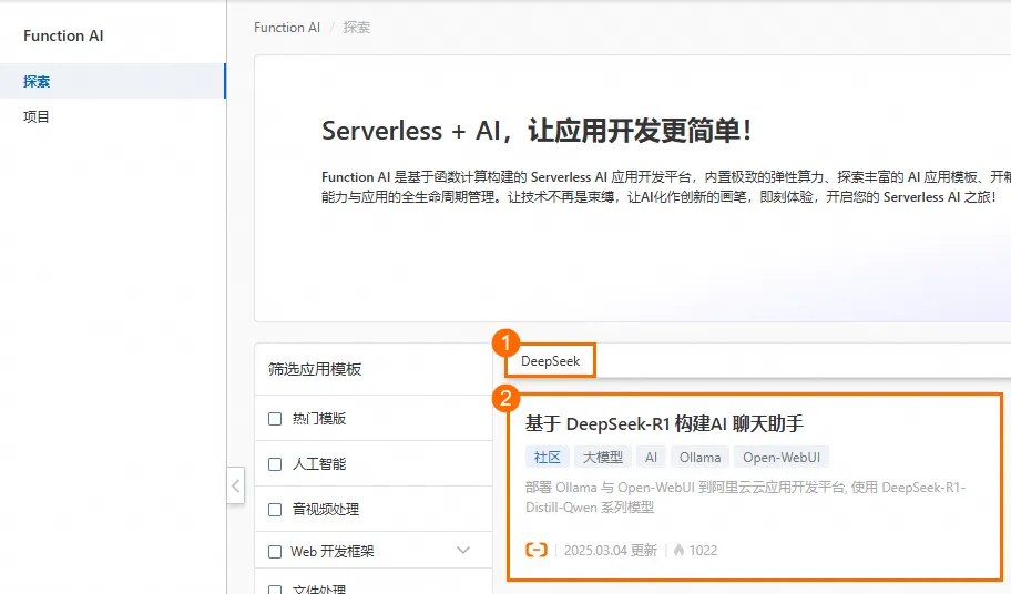 • 方式一:应用模板部署:基于Function AI的模板进行一键部署,部署方式简单快捷。但是由于基于模板进行部署,初次部署使用模板默认提供的DeepSeek-R1-Distill-Qwen-7B模型,导致无法自选模型。部署完成后,可在基础配置中更改模型。