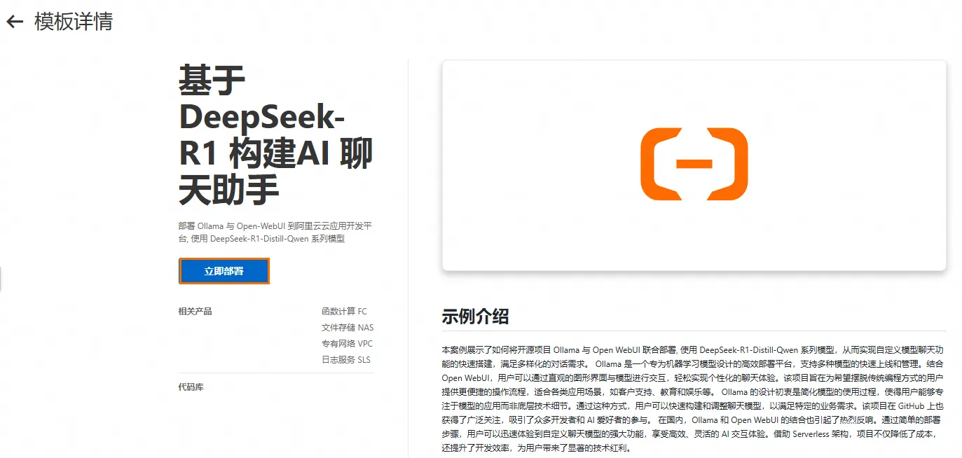 1. 在搜索栏输入DeepSeek进行搜索,单击基于 DeepSeek-R1 构建AI 聊天助手,进入模板详情页,单击立即部署