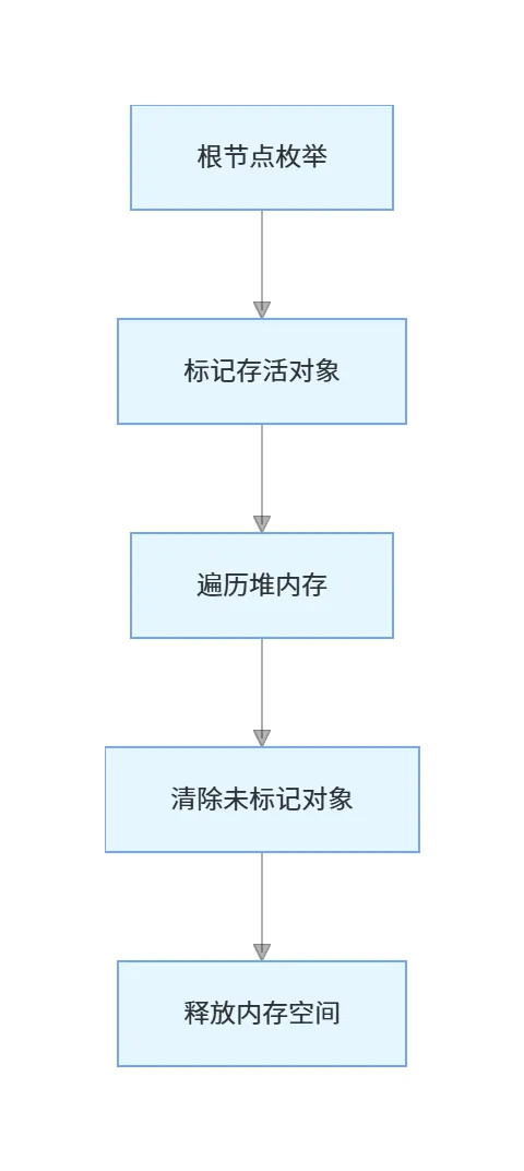 2. 清除阶段:遍历堆内存,回收所有未被标记的对象。