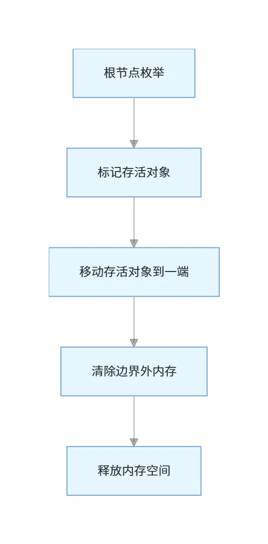 2. 整理阶段:将所有存活对象向内存的一端移动,然后清除边界外的内存。