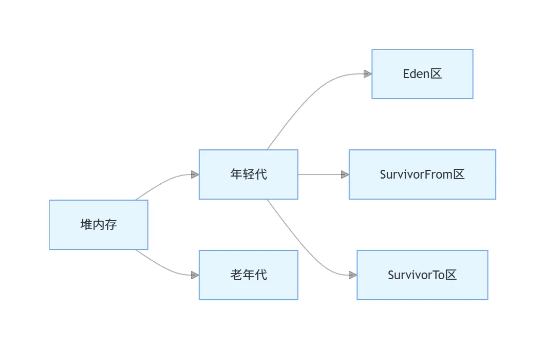 年轻代用于存放新创建的对象,大多数对象朝生夕死,因此采用复制算法。年轻代分为Eden区和两个Survivor区(From和To),默认比例为8:1:1。工作流程