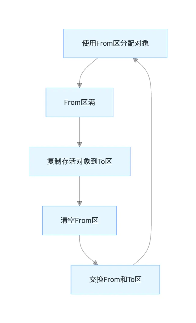 2. 当Eden区满时,触发Minor GC(年轻代GC),将Eden区和From区的存活对象复制到To区。