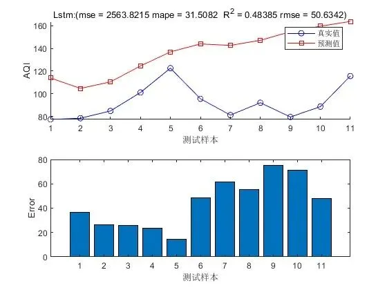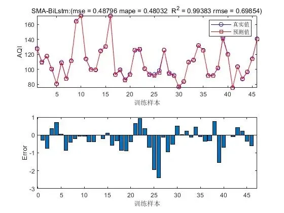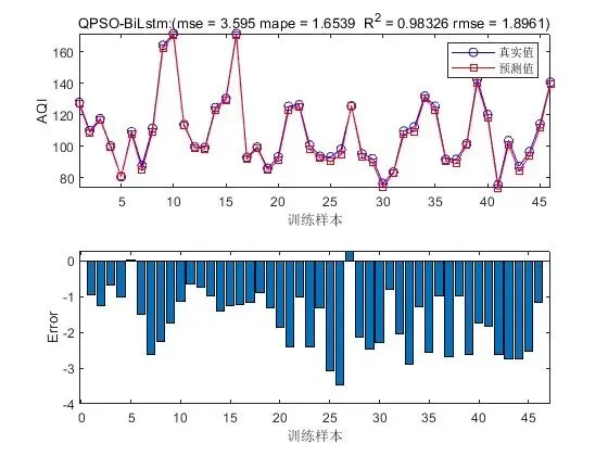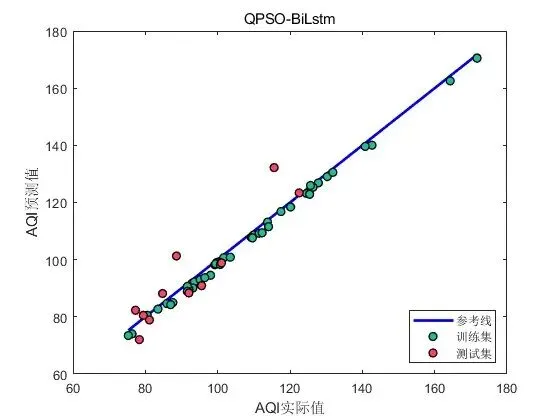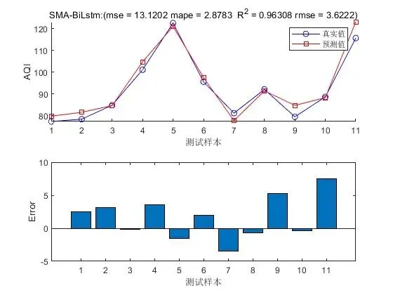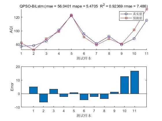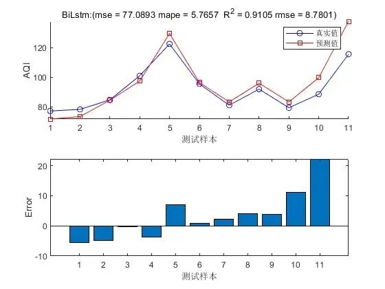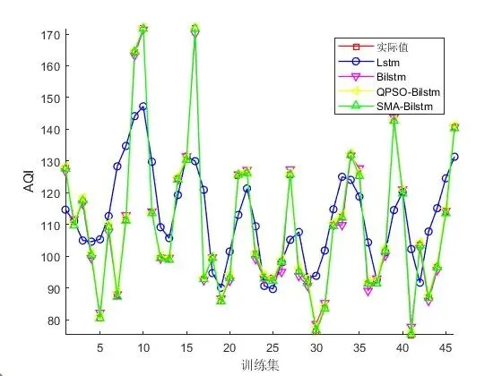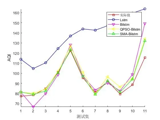 - 预测与评估:使用优化后的超参数重新训练 BiLSTM 模型,然后将测试数据输入到训练好的模型中进行 AQI 预测。最后,通过评估指标(如均方根误差、平均绝对误差等)对预测结果进行评估,以衡量模型的预测性能。