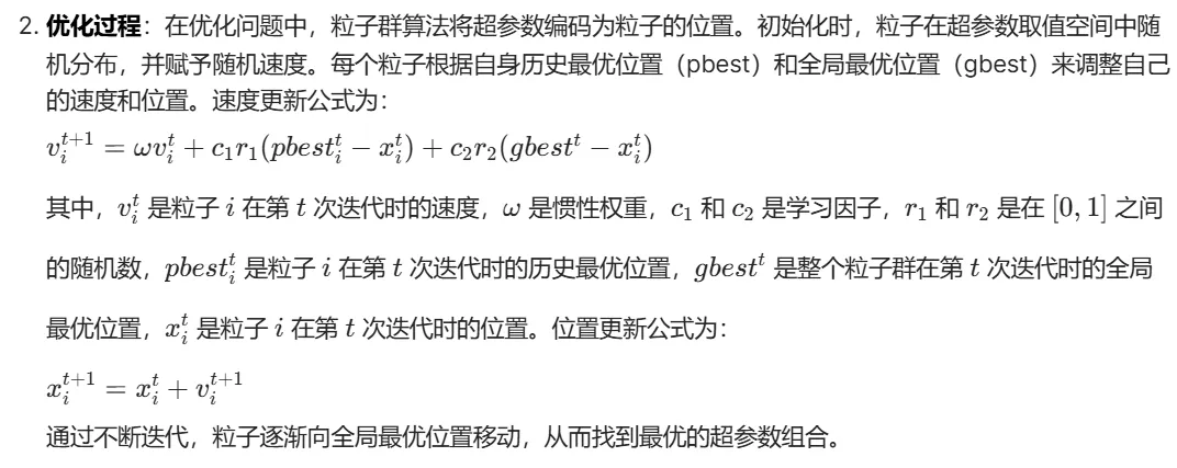 - 群体智能思想:粒子群算法模拟鸟群觅食行为。想象一群鸟在一个空间中随机搜索食物,每个鸟(粒子)都有自己的位置和速度,并且知道自己当前位置的适应度值(即找到食物的好坏程度)以及整个鸟群中最优位置的信息。