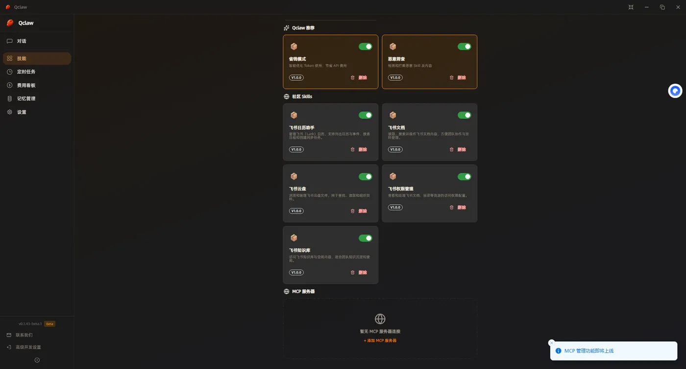 Qclaw 还提供了一些 推荐技能,例如: