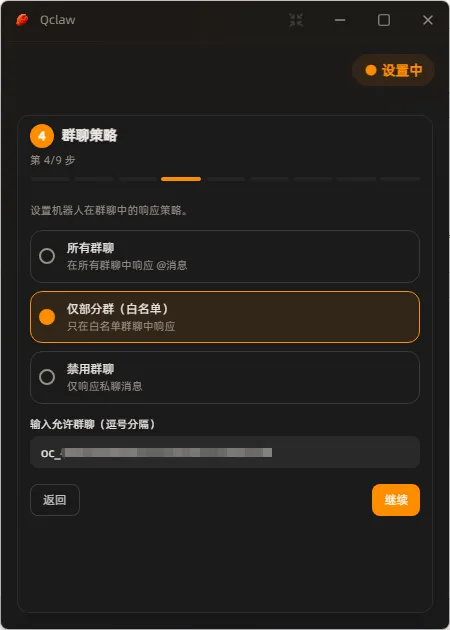 可以设置机器人在哪些群聊中工作。